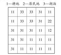 1、单选题 下图表示辽宁西北部某地土地利用的变化,将该区域分为25个方格,每个方格中的两个数字按左右顺序分别代表1979年和2005年土地利用类型,完成下列问题。
