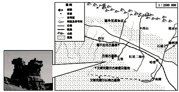 新疆哈密盆地内有很多距今约3000年前的古城堡和古墓群,出土大量木器、陶器、青铜器等文物,为研究地理环境变迁提供了证据。读下图,回答第(1)、(2)题。