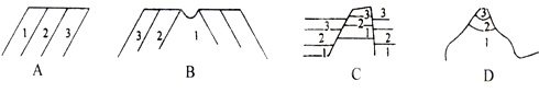 5、单选题  如果从1到3代表地层由老到新,那么下面四图中表示背斜的是(   )