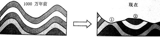 小题2:图示由1000万年前发育到现在,该地区的地表形态的变化主要反映在上部岩石的缺失,是受外力侵蚀作用的结果。