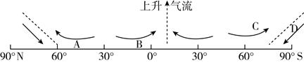 本题解析:(1)根据图示图示的气流运动方向判断,C表示中纬西风,D表示极地东风,故CD之间形成极锋,气流上升,近地面形成副极地低压带。(2)全球气压带风带的移动随太阳直射点的移动而移动,大致北半球夏季北移,冬季南移,图示赤道附近的赤道低压带分布于赤道以南,判断为气压带风带南移,为北半球冬季。(3)图示A表示中纬西风,来自30°附近的副热带高压带。B气流为北半球的低纬信风带,来自30°附近的副热带高压带。(4)结合上题分析,C为盛行西风带,终年在盛行西风带控制下,为温带海洋性气候,终年温和多雨。而B表示信风带,终年受信风带控制,形成热带沙漠气候,终年高温少雨。A表示盛行西风带,受盛行西风与30°附近的副热高压带控制,则形成地中海气候。(5)此时为北半球冬季,受海陆热力性质差异的影响,亚欧大陆上形成亚洲高压,切断了60°附近的副极地低压带,使低压保留在海洋上。