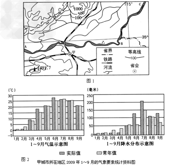 (1 )图1中甲城市名称是? 。该城市所在地区重要的经济作物和粮食作物分别是? 、? 。