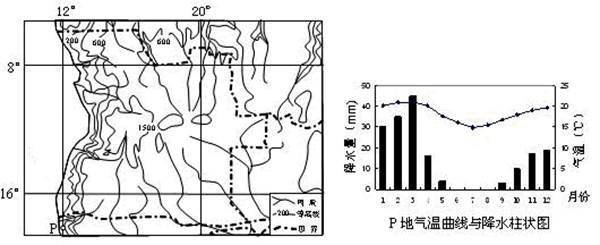 【小题2】读图可知,P地位于非洲西部沿海地区,且位于低纬度地区,在结合右侧的气温曲线与江水柱状图可知,P点夏季气温高,冬季气温稍低;该地沿海地区有寒流经过,在根据江水柱状图可知,该地终年降水量较少。