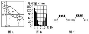 D湖泊(图a)的湖面海拔约3800米,降水资料如图b所示。D湖沿岸地区地形平坦,发现有大量古代农耕遗迹,包括相互交织的人工堆土高台、人工水渠(图c所示)以及人工运河和水塘。