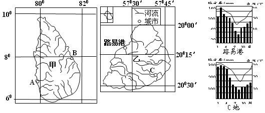 本题解析: (1)本题考查河流水系特征的描述。两地都为岛屿,地势中部高,四周低;气候湿润,降水量大;岛屿面积狭小。所以河流的水系特征为河流流向均由中心向四周呈放射状分布;河流众多,水系发达;河流短促。 (2)根据两岛屿所处的地理位置判断,甲为热带季风气候区,乙地终年受东南信风控制。甲国为热带季风气候,夏半年受西南季风的影响,受地形影响西部迎风坡地形雨丰富;冬半年受东北季风影响,受地形影响东部迎风坡地形雨丰富;乙国东南部受来自印度洋的东南信风的影响,形成丰富地形雨;(西北部处在东南信风的背风坡,降水少。 (3)本题考查城市区位因素。影响城市的区位因素有自然因素和社会经济因素。其中自然因素包括河流、地形、气候等;社会经济因素包括资源、交通、政策等。两国城市分布在沿海的平原地区。水源充足、交通便捷、地势平坦。