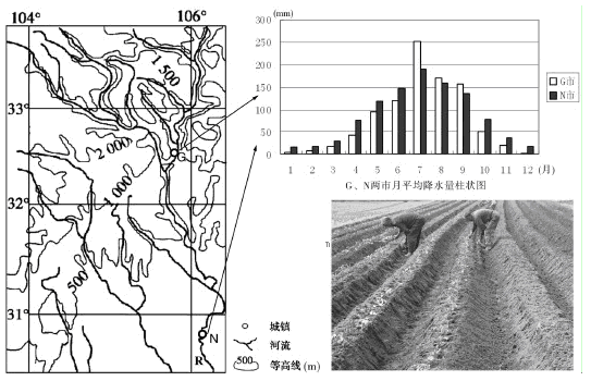 R 河是长江水系含沙量最大的支流。N 市所在区域是我国的红薯主产区之一,红薯是地下块根作物,喜光喜温,怕旱怕涝,种植时需要起垄栽培。图1示意 R 河及周边区域自然地理环境的相关信息,图2示意 N 市所在区域红薯的起垄种植。