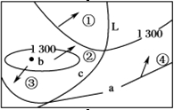 【小题1】L为河流,河流在山谷中形成,说明a>1300,河流流向大致从南向北流;利用“大于大,小于小”的规律,b<1300,箭头应指向里,②③不对;河流L在山谷里,箭头应指向L,所以④也不对,选①。