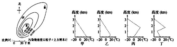 【小题2】气温的分布在对流层是随高度的增加而呈降低,如图中的甲,这是正常现象;当气温随高度增加而增加时,说明出现了逆温现象,大气不会出现对流运动,所以污染会很严重,乙、丙、丁三个图中,气温随高度增加而增加最明显的是丙,说明其大气污染最严重,故选C.