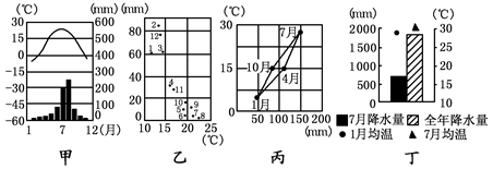 小题1:根据四地的气温、降水量资料反映,甲最低月温在0°以下,降水集中于夏季,判断为温带季风气候;乙图雨热不同期,判断为地中海气候,丙最低月温在0°以上,降水集中于夏季,故判断为亚热带季风气候;丁地终年高温,降水量7月尤其丰富,判断为热带季风气候。故①④正确。