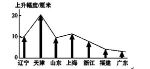 5、单选题 科学家观测研究表明,近30年来我国沿海海平面总体上升了9厘米,但沿海各省、市、自治区海平面的上升幅度并不相同。读图完成小题。