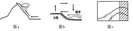 小题3:图c中的阴影部分代表大陆,另一部分代表海洋,图中等值线表示: