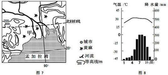 黄麻适合在湿热的气候环境中生长。收获的黄麻在水中浸沤后,才能进行初加工以获取制作麻袋、麻布、纸张等的原料。图7中甲城市为世界最大的麻纺工业中心,也是该地区联系河运和海运的重要港口。图8为甲城市的气候资料。
