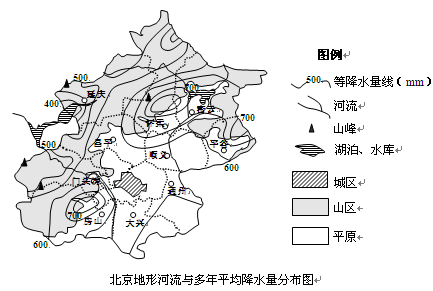 小题1:此题考查学生的读图能力。图中反映北京地形河流与多年平均降水量分布。北京降水量在图中怀柔、密云降水量较大,顺义、通州的降水量较小,排除A;山区延庆降水量400—450mm,平原房山降水量在600—650mm,排除B;北京各地的纬度相差无几,大气环流一样,排除D;的故选B。图中最大的降水量750—800mm,最小值350—400mm,两者的差值350—450mm;故选C。