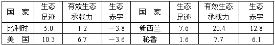 4、单选题 ? 生态足迹是人们所消耗的每种消费品的生物生产面积的总和。有效生态承载力是自然能够对人类提供的生态服务。分析表中的数据,回答1—2题。