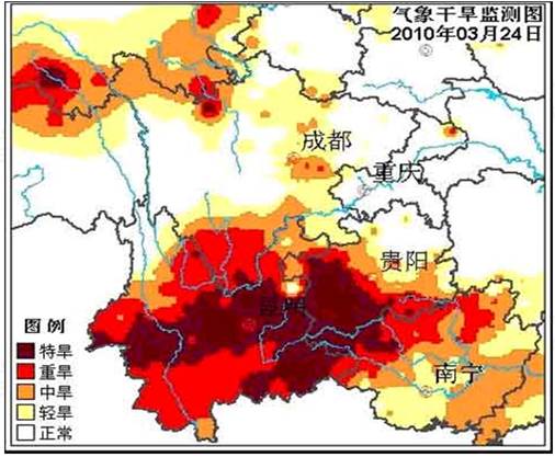 4、综合题 2010年春季,我国西南地区遭遇百年一遇的特大旱灾。截至3月30日,中国耕地受旱面积1.16亿亩,其中作物受旱9068万亩,重旱2851万亩,干枯1515万亩,待播耕地缺水缺墒2526万亩;有2425万人、1584万头大牲畜因旱饮水困难。结合下图,回答下列问题。(9分)