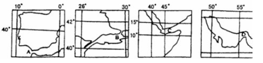 本题解析:本题考查世界重要的海峡。结合图示的经纬度位置和海陆轮廓判断,A表示直布罗陀海峡;B表示土耳其海峡;C表示曼德海峡;D表示霍尔木兹海峡。