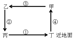 【小题1】根据气压的形成原理可知,近地面丙、丁气压高于高空甲、乙气压;近地面上丁点气流上升,丙点气流下沉,则丙点气压高于丁点气压,同理高空中甲点气压高于乙点气压。因此四地气压最高的是丙地。
