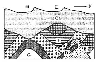2、单选题 下图为某地地质剖面图,其中,C为沉积物,B、F、G为沉积岩,A、D为不同时期的岩浆岩,而且该地没有发生过地层倒置现象。读图回答:据图判断该地发生过的地质作用有