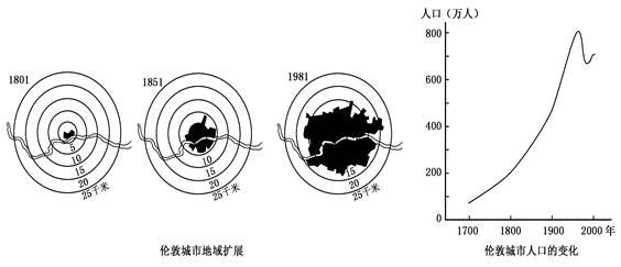 5、单选题 读伦敦城市地域发展示意图和城市人口变化示意图,回答问题。