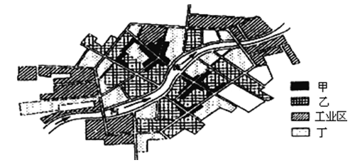1.甲位于市中心,分布面积小,表示商业区;乙主要分布于市中心的周围,占地面积广,为住宅区;丁位于主要的工业区和住宅区之间为绿化用地。故选C项。