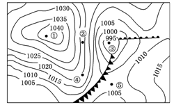 (4)本题考查锋面系统与天气,⑤地此刻受暖气团控制,将要受冷锋影响,所以天气将出现阴天、刮风、雨雪等。过境后天气转晴,气温降低,气压升高。