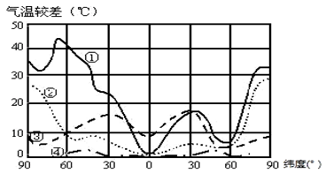 【小题1】由于海陆热力差异,陆地大于海洋,年变化大于日变化,①②为年较差线,③④为日较差线。读图可知,图中曲线③的变化幅度大于曲线①,故曲线③为大陆气温日较差曲线。