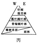 (4)丙地东坡为迎风坡,从海洋上来的水汽,在东坡形成地形雨,且东坡受暖流影响,增温增湿,故东坡基带形成雨林带;西坡为背风坡,降水偏少,形成稀树草原带。