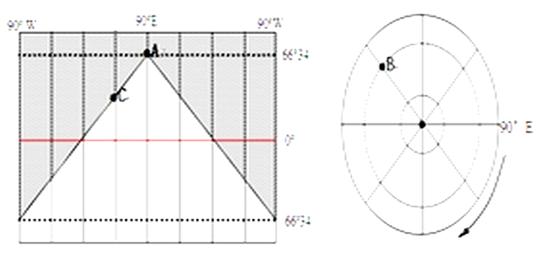 (4)请将左图此刻的昼夜状况转绘到右图中,要求:绘制出晨昏线,用