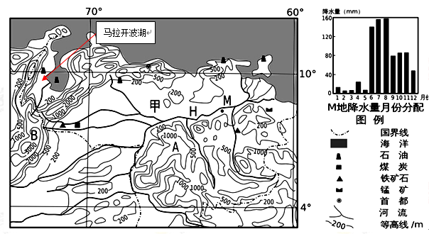 3、综合题 结合材料,读图回答下列问题。 该区域的马拉开波盆地四周山地环绕,盆地中心是南美洲最为湿热的马拉开波湖,该湖除北部委内瑞拉湾沿岸气候干燥、年降水量不足500毫米外,湖区大部分高温多雨,年平均降水量1500毫米以上。湖泊东部的H河水能蕴藏量大,流域面积88万平方公里,人口约有225万,人烟稀少。图中甲国为拉丁美洲人均GDP较高的国家,与中国有良好的贸易关系,2006年8月双方签订了农田灌溉系统建设、矿产品开采、机电生产等多项协议。