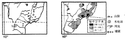 2、综合题  (8分)下图分别示意某国局部地区自然要素与人口、城市分布。读图并结合所学知识完成下列各题。