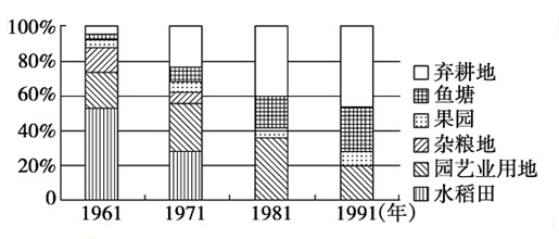 1.1961年以来,该地农业土地利用类型变化幅度最大的是2.图示地区最有可能位于3.从1961年至1991年,该地区弃耕地面积逐年扩大,其原因可能是