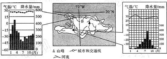 (1)图中A地的气候类型是?,B地的气候类型是??。试分析A、B两地降水差异的主要原因。(10分)