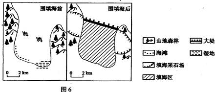 A.劳动力短缺 B.低温冷害更严重 C.人均耕地面积减小 D.洪涝灾害更频繁 3、综合题 图6是某海湾围海造地前后的对比图。指出围填海前后的变化,并就其中一项变化,说明其对环境带来的负面影响及对策。(10分) 4、综合题 (26分)阅读材料回答问题。