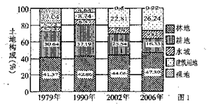5、单选题 读我国某城市土地利用结构变化图(图l),回答1—2题