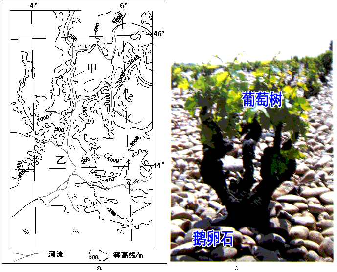 葡萄的糖分含量越高,酿制出的葡萄酒酒精度越高。葡萄生长过程中,特别是成熟期的光照及昼夜温差与其糖分积累呈正相关。图a中甲、乙两地均为优质葡萄产地。图b为乙地典型的葡萄种植园景观。世界上酒精度最高(16.2度)的优质葡萄酒就是使用乙地及其附近所产的葡萄酿制而成的。