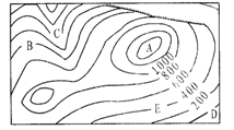 小题1:图示等高线最低在C以北地区,海拔低于0M(即-400至-200M之间),海拔最高为A处,根据高于高值的原则,海拔高度为1200---1400M,故两地的相对高度最大可能小于1800M,故选C项。