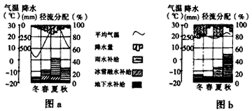 1、综合题  ? 甲图、乙图分别为两地区等高线示意图,图a、图b分别为流经乙、甲两图所示地区主要河流的径流季节分配和补给类型图以及流域的气温曲线和降水柱状图,读图回答下列问题。