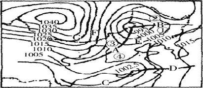 本题解析:本题考查等压线天气图的综合分析。(1)图示位于北半球,根据北半球气旋水平气流呈逆时针辐合,故判断BD处形成暖锋,AC处形成冷锋。(2)图示③处的冷锋即将向E地移来,故E地将经历明显的天气变化。(3)图示E处位于冷锋的锋前,为暖气团控制,根据风从高压指向低压,北半球向右偏,可画出F地的风向。(4)锋面的冷气团一侧为雨区。