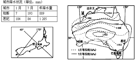 (1)分别对比冬夏两季时珀斯与悉尼降水差异并分析其原因。(9分)