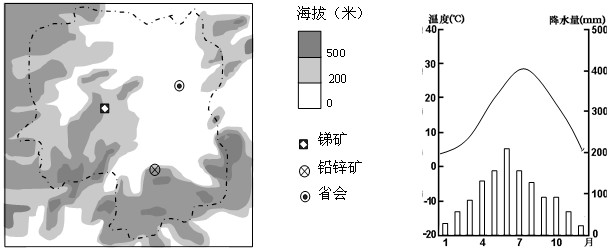 4、综合题 左图为我国某省的地理资料,右图是其省会城市的气候统计数据,据图描述该省地形和气候特征。