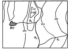 4、单选题 右图为我国华北某地区图,图中R1为输水管道,R2、R3为天然河流,实线表示等高线,图中某村与甲处的相对高度可能是