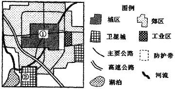 (1)从图中可以看出D区建筑物高大密集,而且位于市中心,所以D代表中心商务区的,A区位于城市外围,距离市中心较远,而且占地面较大,所以代表工业区的是A,低级住宅区往往与工业区相联系,离工业区较近,有利于工人上下班,节省交通费用,所以C代表低级住宅区,高级住宅区往往与工业区、低级住宅区背向发展,,位于城市外围环境较好的地区,所以F代表高级住宅区。