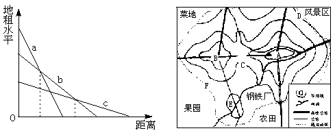 3、综合题 经济因素是市场经济条件下影响城市功能分区的主要原因。一块土地由哪种活动占有,取决于这块土地的租金高低和各种活动的付租能力两方面。图6—16所示为各类土地利用付租能力与市中心距离关系图。图6—17所示为某城市地租分布等值线图。分析回答下列问题。