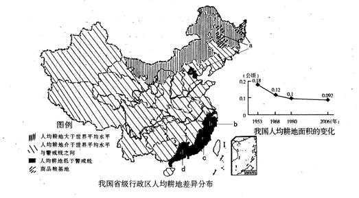 (2)说明b、c、d三省人均耕地数量少的共同原因是什么?