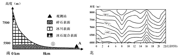 2、单选题 冰川表面的气温与同海拔自由大气相比,始终处于稳定的低温状态,左图是我国某山地冰川分布剖面图,右图是某日观侧站A处上空温度垂立分布的日变化图(单位℃)。若仅从热力环流角度考虑,完成下列问题。