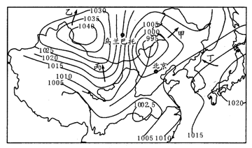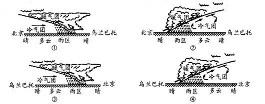 1.图中甲、乙、丙、丁四个箭头能正确表示当地风向的是2.沿乌兰巴托一北京一线所作的天气系统垂直剖面示意图正确的是