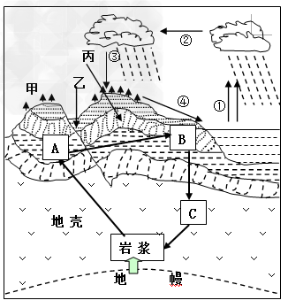?(1)图中A、B、C构成了岩石的相互转化,其中属于沉积岩的是________(字母),属于变质岩的是_______(字母)。