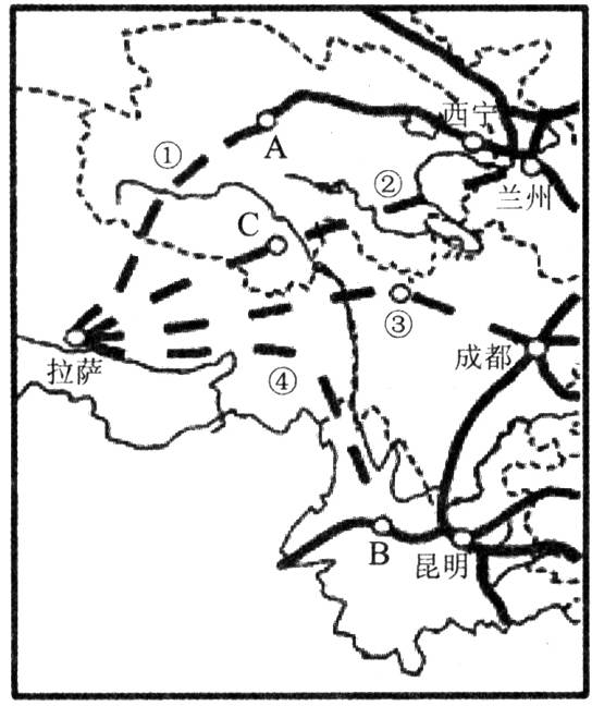 1、综合题 青藏铁路于2006年7月1日试营运全线铺通,是世界上最高、最长的高原铁路。下图所示的是青藏铁路路径和走向的四种方案:①青藏方案;②甘藏方案;③川藏方案;④滇藏方案。读图回答下列问题:(10分)