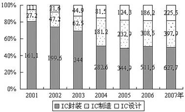 5、单选题 IC产业(集成电路产业)是电子信息产业的基础,一般由设计、制造、封装三个环节构成,珠江三角洲和长江三角洲地区是我国最重要的IC产业基地。下图为2001—2007年我国IC产业产值(亿元)结构变化图。完成下列问题。
