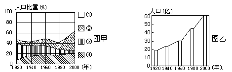 2、单选题 下面图甲是“发达国家和发展中国家城乡人口比重的变化情况图”,图乙是“世界人口增长情况图”。